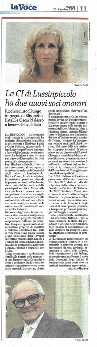 Oscar Nalesso, nato a Mogliano Veneto (Treviso), Capitano di Lungo Corso, diplomato con il massimo dei voti all’Istituto Tecnico Nautico di Trieste, ha navigato per quindici anni con il Lloyd Triestino. E’ stato Direttore del Porto di Chioggia, Consigliere Delegato alla Pianificazione, Programmazione e Promozione, ha ricoperto numerosi incarichi nell’ambito della nautica e dell’Associazione Porti Italiani. Attualmente è membro dell’Assemblea del Consiglio Superiore dei Lavori Pubblici. Dal 2009 ha ideato e realizzato annualmente l’evento “Ottobre Blu” per la divulgazione della cultura del mare nell’Alto Adriatico. In tale contesto, durante “Ottobre Blu 2010” dal titolo “Vento, Vela e Colore” in onore dell’Ammiraglio Straulino, è iniziato il rapporto di collaborazione con l’Amministrazione Comunale e la Comunità degli Italiani di Lussinpiccolo, gettando le basi per un gemellaggio tra Chioggia e Lussino. “Sono sinceramente commosso, ha detto Nalesso, per la manifestazione di stima del Presidente e dei soci della CIL ai quali desidero far giungere il mio più affettuoso sentimento di gratitudine.” Le nomine sono avvenute all’unanimità durante l’Assemblea dei Soci del 4.12.2025. Congratulazioni ai nuovi soci onorari.